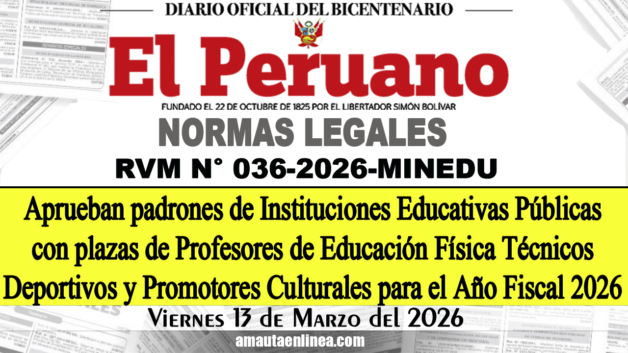 Que, mediante la Resolución Viceministerial N° 027-2026-MINEDU, se aprueba el Anexo 1: “Padrón de Instituciones Educativas Públicas del nivel Primaria focalizadas con plazas de Profesores de Educación Física para el Año Fiscal 2026”, el Anexo 2: “Padrón de Instituciones Educativas Públicas de Primaria y Secundaria focalizadas con plazas de Técnicos Deportivos para el Año Fiscal 2026” y el Anexo 3: “Padrón de Instituciones Educativas Públicas de Primaria y Secundaria focalizadas con plazas de Promotores Culturales para el Año Fiscal 2026”;