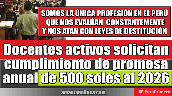 Docentes activos solicitan cumplimiento de promesa anual de 500 soles al 2026