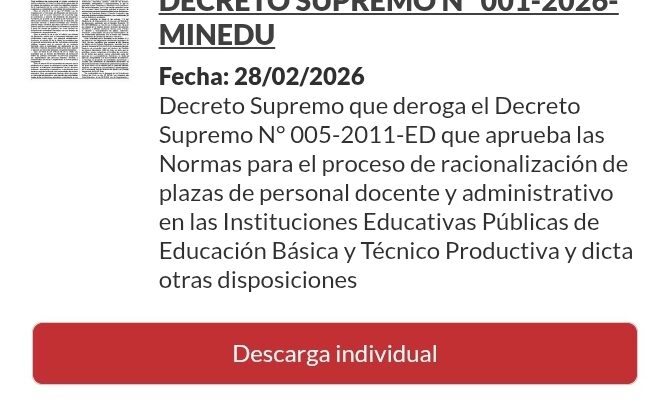 Decreto Supremo que deroga el Decreto Supremo Nº 005-2011-ED, que aprueba las “Normas para el proceso de racionalización de plazas de personal docente y administrativo en las Instituciones Educativas Públicas de Educación Básica y Técnico Productiva” y dicta otras disposiciones