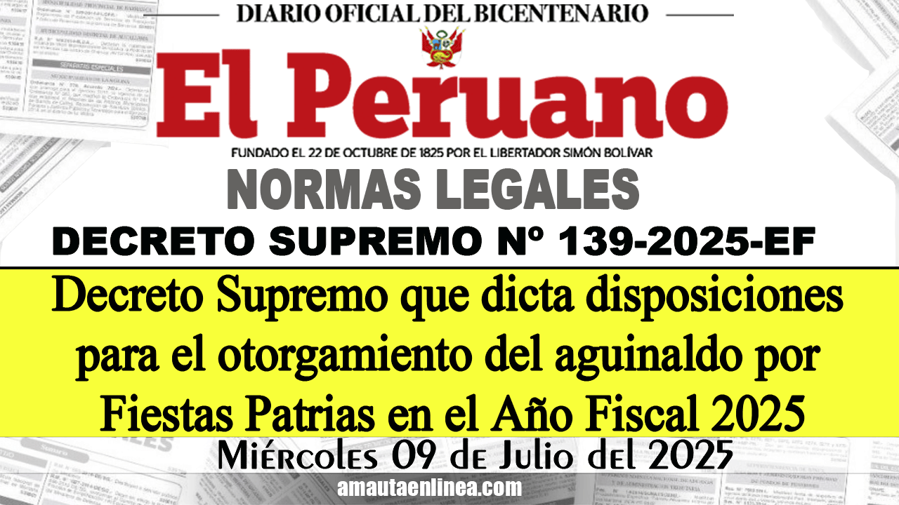 El presente Decreto Supremo tiene por objeto establecer disposiciones reglamentarias para el otorgamiento del aguinaldo por Fiestas Patrias, fijado hasta por la suma de S/ 300,00 (TRESCIENTOS Y 00/100 SOLES), el cual se abona, por única vez, en la planilla de pagos del mes de julio de 2025.