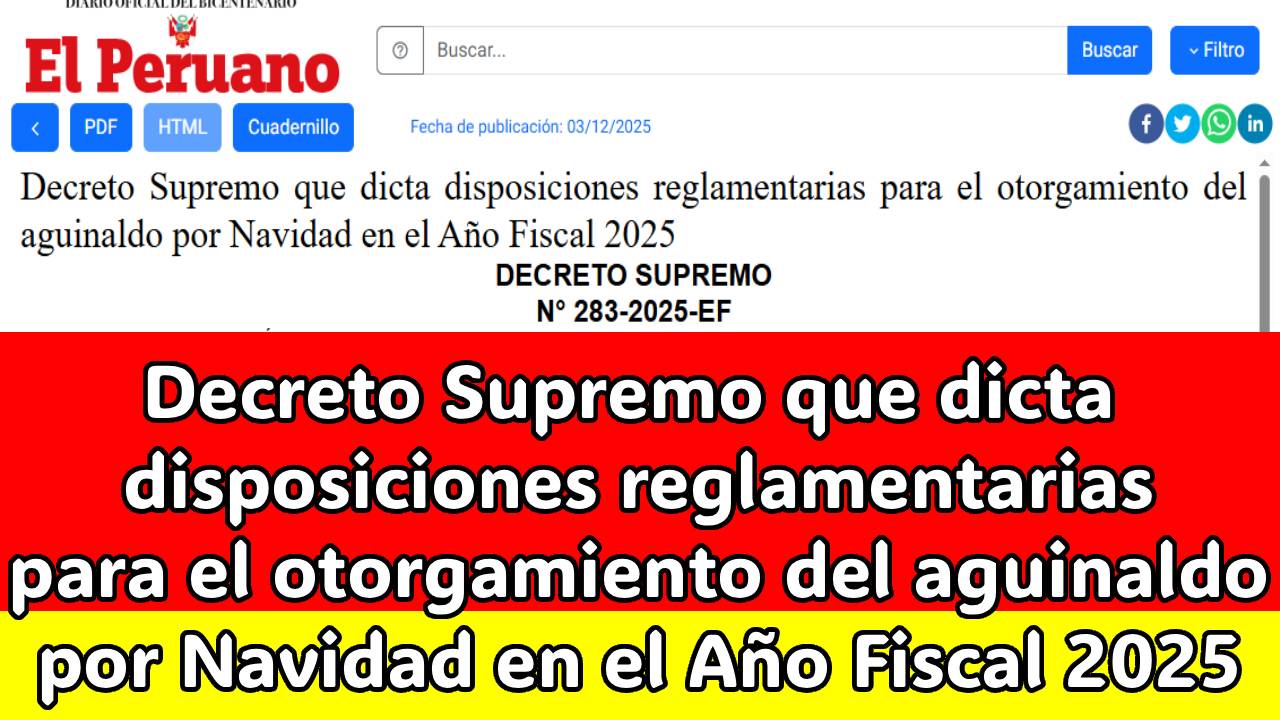 El presente Decreto Supremo tiene por objeto establecer disposiciones reglamentarias para el otorgamiento del aguinaldo por Navidad, fijado hasta por la suma de S/ 300,00 (TRESCIENTOS Y 00/100 SOLES), el cual se abona, por única vez, en la planilla de pagos del mes de diciembre de 2025.