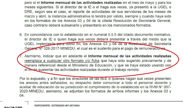 Así en el punto 7.- de dicho OFICIO MÚLTIPLE señala: “7. Asimismo, indicar que en adelante el Informe mensual de las actividades realizadas reemplaza a cualquier otro formato y/o ficha que haya sido sugerido previamente y de manera referencial desde el Ministerio de Educación, y que se haya estado usando con el fin de sustentar las actividades realizadas durante el trabajo remoto”.En tal sentido, ni los Directores de IIEE ni especialistas de Ugel o DRE tienen competencia para solicitar la elaboración o llenado de otros informes semanales o diarios por no estar contemplado en norma expresa ya que conforme a RVM Nº 097-2020-MINEDU, Modificada por la RVM Nº 098-2020-MINEDU solo debe presentar el Informe mensual de las actividades el ultimo día hábil de cada mes.