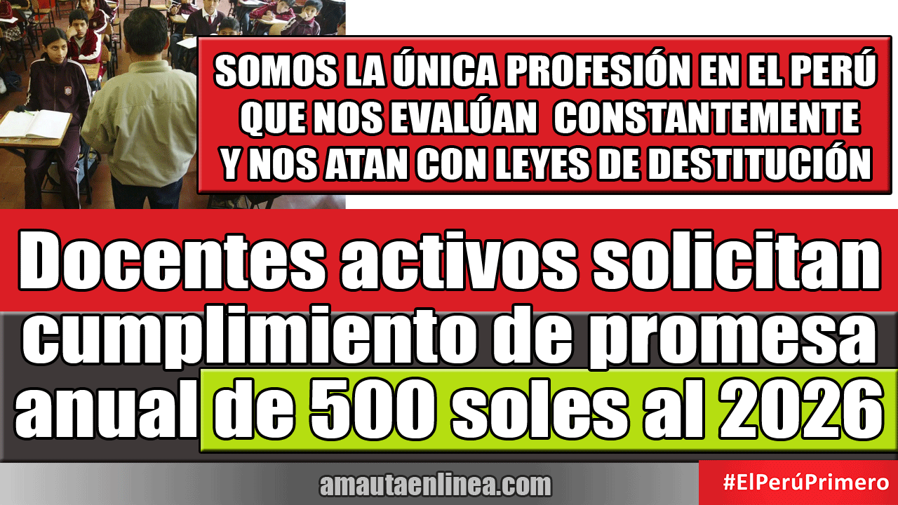 Docentes activos solicitan cumplimiento de promesa anual de 500 soles al 2026