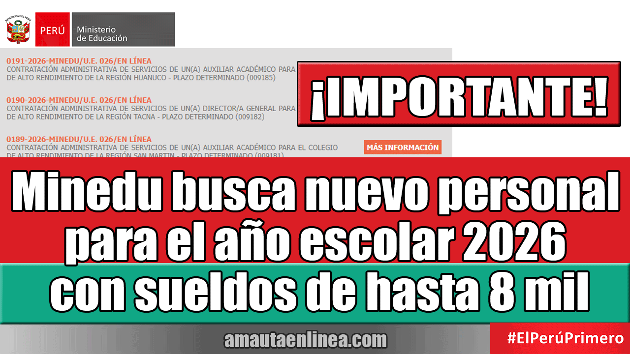 Se trata de una de las convocatorias más amplias del sector Educación en lo que va del año, con sueldos que oscilan entre S/ 2.500 y S/ 8.000. Las plazas se distribuyen en regiones como Amazonas, Áncash, Apurímac, Arequipa, Cajamarca, Cusco, Huancavelica, Huánuco, Ica, Junín, La Libertad, Lambayeque, Lima, Loreto, Madre de Dios, Pasco, Piura, Puno, San Martín, Tacna y Tumbes.