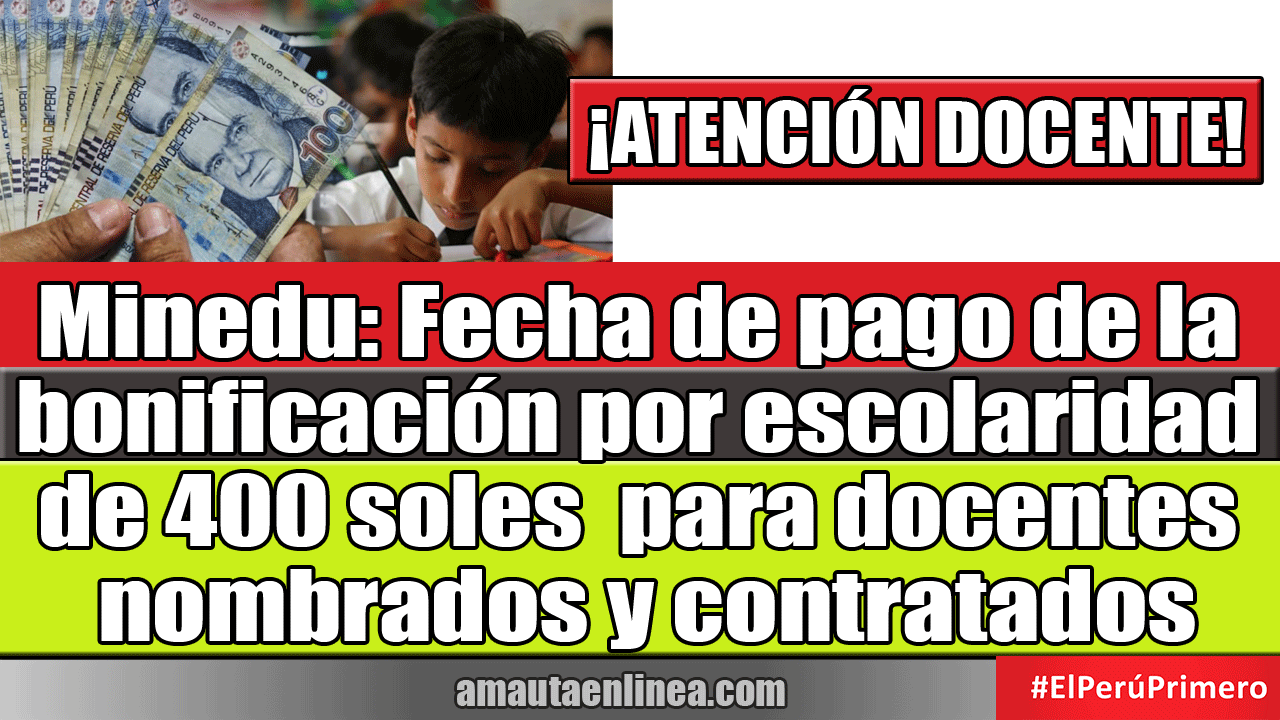 «La bonificación por escolaridad, que se incluye en la planilla de pagos correspondiente a enero y cuyo monto asciende hasta la suma de S/400. Para el caso de los profesores contratados y auxiliares (…) el pago de la bonificación por escolaridad, cuyo monto corresponde al señalado en el presente literal, se incluye en la planilla de pagos del mes de junio«, precisa.