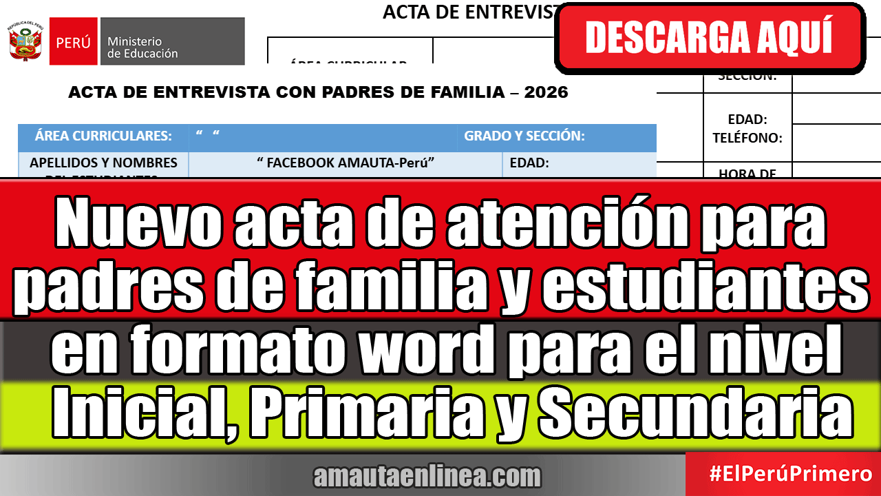 Estimados docentes en esta oportunidad te queremos compartir el Acta de entrevista de atención para el estudiante y padres de familia 2026 en el nivel Inicial Primaria y Secundaria.
