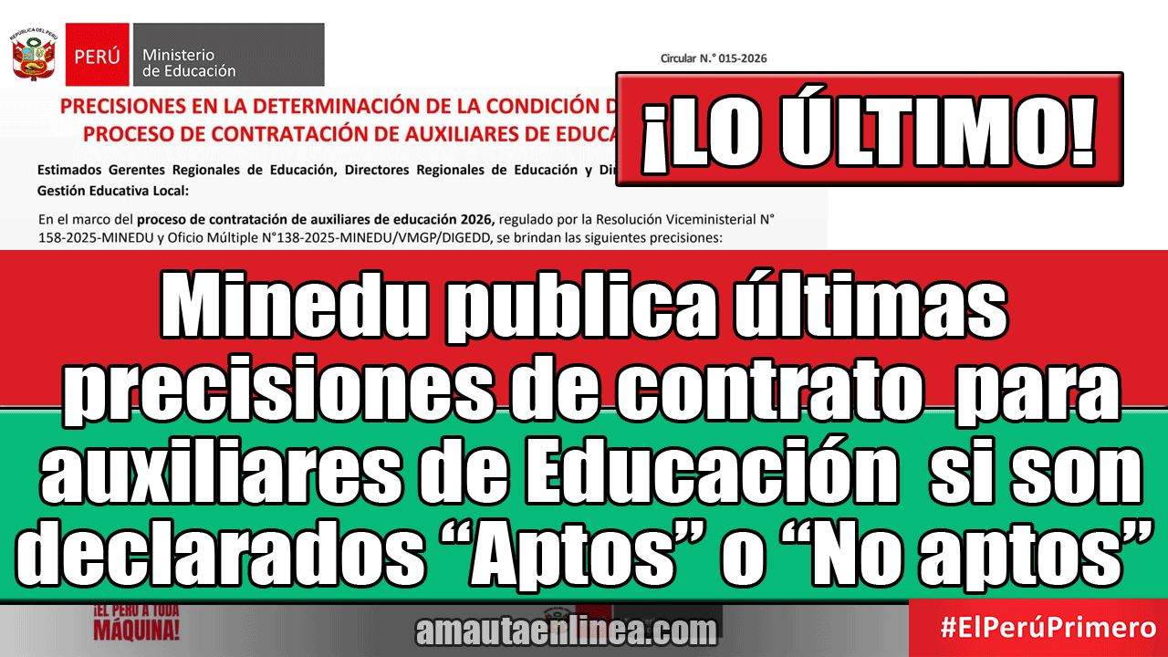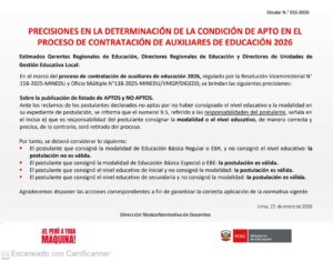 En el marco del proceso de contratación de auxiliares de educación 2026, regulado por la Resolución viceministerial Nº 158-2025-MINEDU y Oficio Múltiple Nº 138-2025-MINEDU/VMGP/DIGEDD, se brindan las siguientes precisione:
