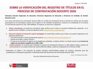 En el marco del proceso de contratación docente 2026, los comités de contratación tienen la función de verificar que los títulos presentados por los postulantes cuenten con el registro en las entidades competentes, conforme a lo establecido en el numeral 5.13 del decreto supremo Nº 022-2025-MINEDU. Al respecto se comunica lo siguiente: