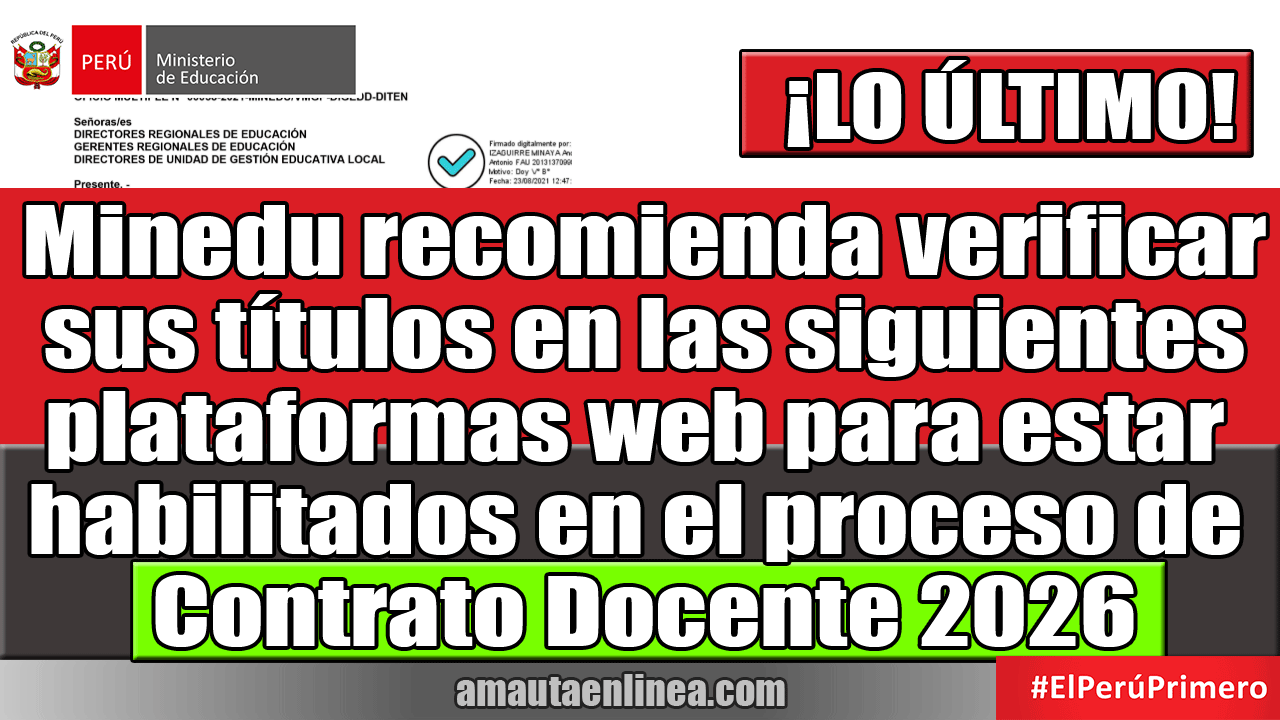 Minedu recomienda verificar sus títulos en las siguientes plataformas web para estar habilitados en el proceso de Contrato Docente 2026