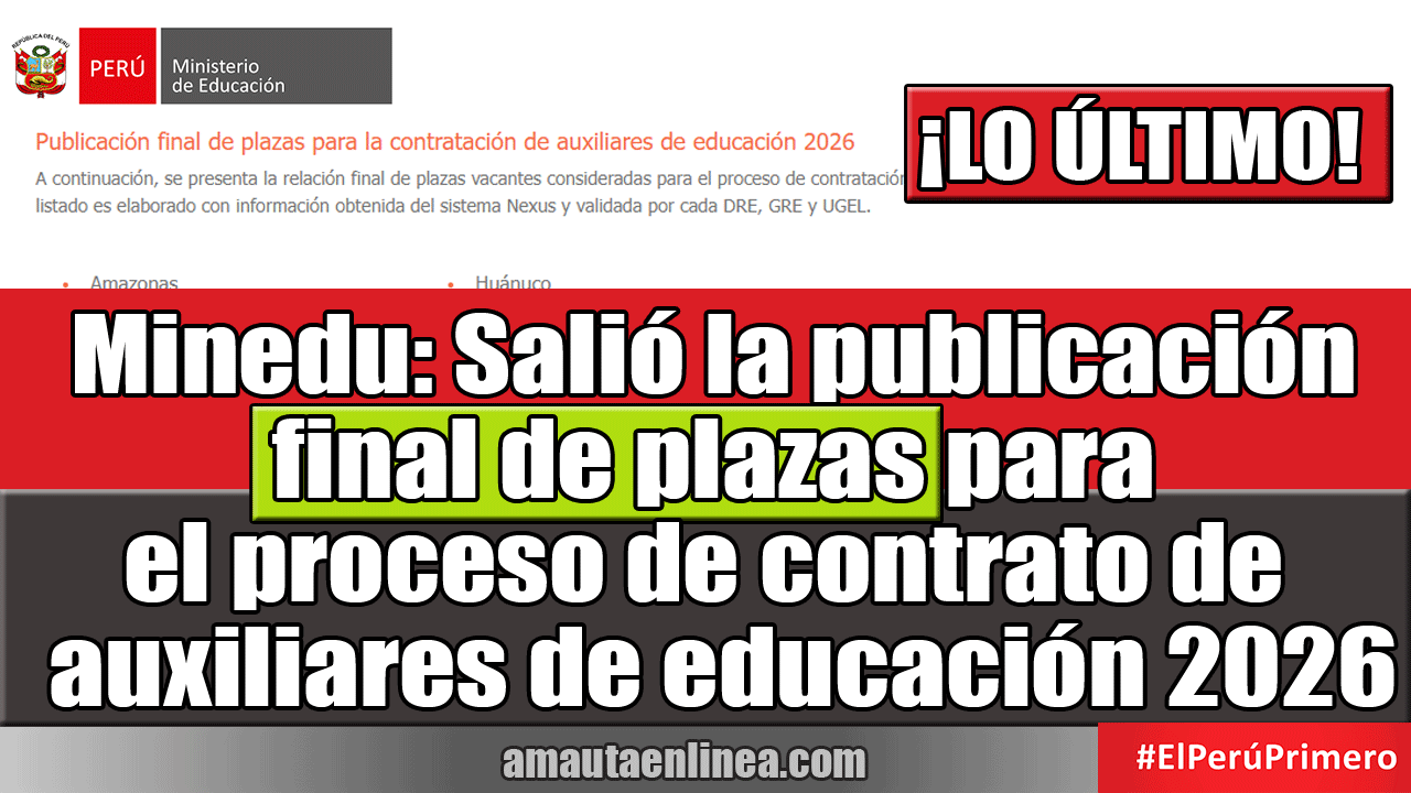 A continuación, se presenta la relación final de plazas vacantes consideradas para el proceso de contratación de auxiliares de educación 2026. Este listado es elaborado con información obtenida del sistema Nexus y validada por cada DRE, GRE y UGEL.