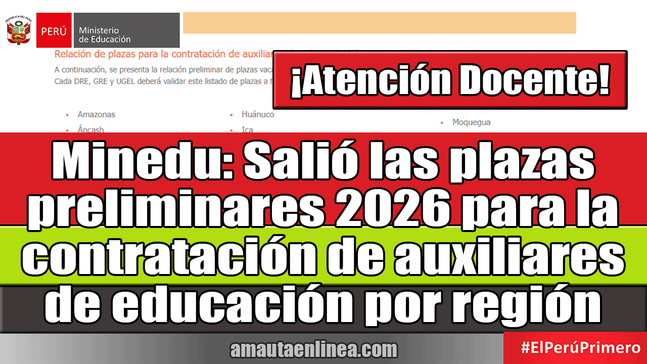A continuación, se presenta la relación preliminar de plazas vacantes consideradas para el proceso de contratación de auxiliares de educación 2026. Cada DRE, GRE y UGEL deberá validar este listado de plazas a fin de que realicen la publicación final el 9 de enero de acuerdo al cronograma.