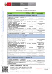 c. Las etapas de “Renovación del contrato docente”, “Contratación por resultados de la PN” y “Contratación por evaluación de expedientes”, se implementarán teniendo en cuenta las fechas establecidas en el cronograma adjunto.