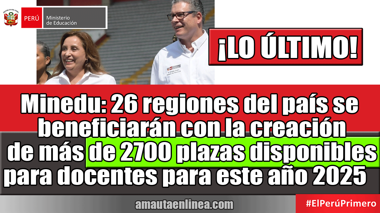 Un total de 2,750 nuevas plazas docentes y directivas creó el Ministerio de Educación (Minedu) este 2025 con una inversión acumulada de más de 129 millones de soles. Esta medida beneficiará a más de 70,000 estudiantes en las 26 regiones del país, fortaleciendo la cobertura y calidad del servicio educativo.